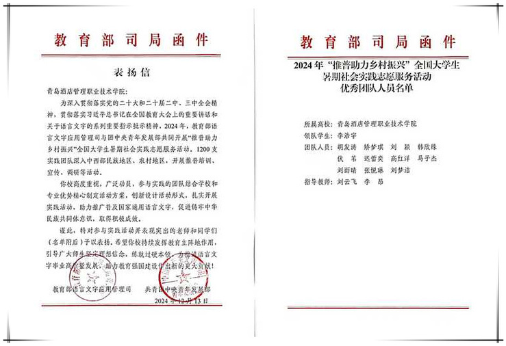 青島酒店管理職院獲評2024年“推普助力鄉村振興”全國大學生暑期社會實踐志愿服務活動優秀團隊