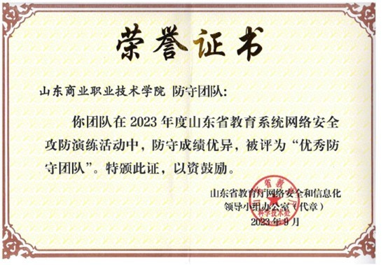 9月12日,2023年國家網(wǎng)絡安全宣傳周山東省校園日活動啟動儀式上對2023年度山東省教育系統(tǒng)網(wǎng)絡安全攻防演練表現(xiàn)突出的攻擊隊伍和優(yōu)秀防守單位進行現(xiàn)場表彰,山東商職學院獲評“優(yōu)秀防守團隊”。