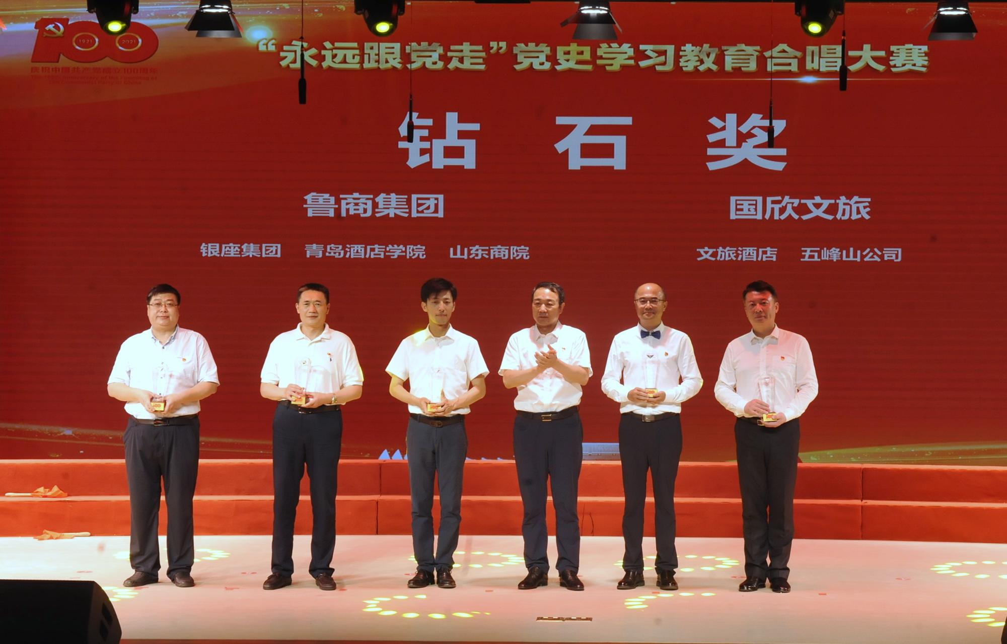 在隨后舉行的“永遠(yuǎn)跟黨走”黨史學(xué)習(xí)教育合唱大賽總決賽環(huán)節(jié),晉級決賽的9支參賽隊(duì)伍為現(xiàn)場觀眾帶來了一場精彩絕倫的視聽盛宴。經(jīng)過激烈角逐,最終銀座集團(tuán)、青島酒店學(xué)院、山東商院3個單位獲得“鉆石獎”,7個單位獲得“金獎”,13個單位獲得“銀獎”。魯商集團(tuán)離退休中心獲得特殊貢獻(xiàn)獎。