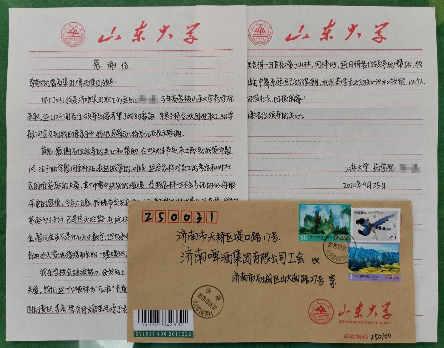 9月27日,濟啤集團收到困難職工劉瑩女兒從學(xué)校寄來的感謝信。